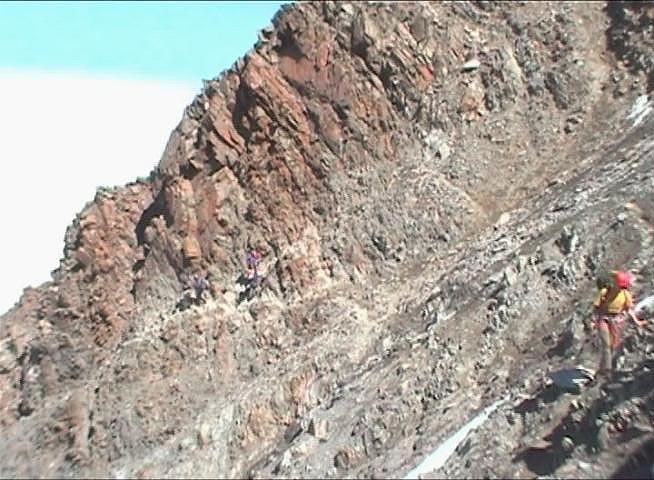 Další část je zespodu částečně jištěná lanem čehož využíváme.Stoupání je namáhavé a velmi pomalé a navíc