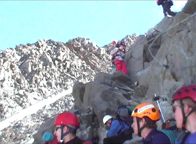 chatu Gouter bude dost náročná. Po občerstvení a krátkém odpočinku se navazujeme na lano a po okraji