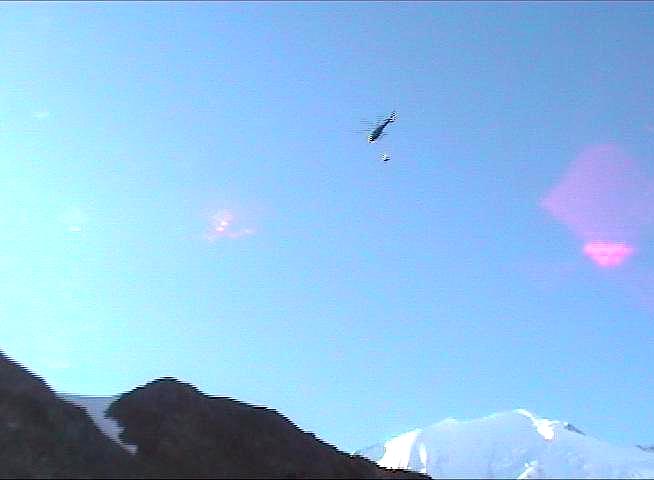 na nic, přesto lezeme dál.Kolem 15:00 hod dosahujeme chaty Gouter (3817 m). Nepředstavitelná makačka a