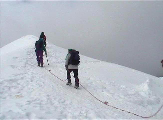 Lidí je opět mnoho. Kuloár je naštěstí opět v klidu a kolem 12:00 hod. jsme u chaty Tete Rousse.
